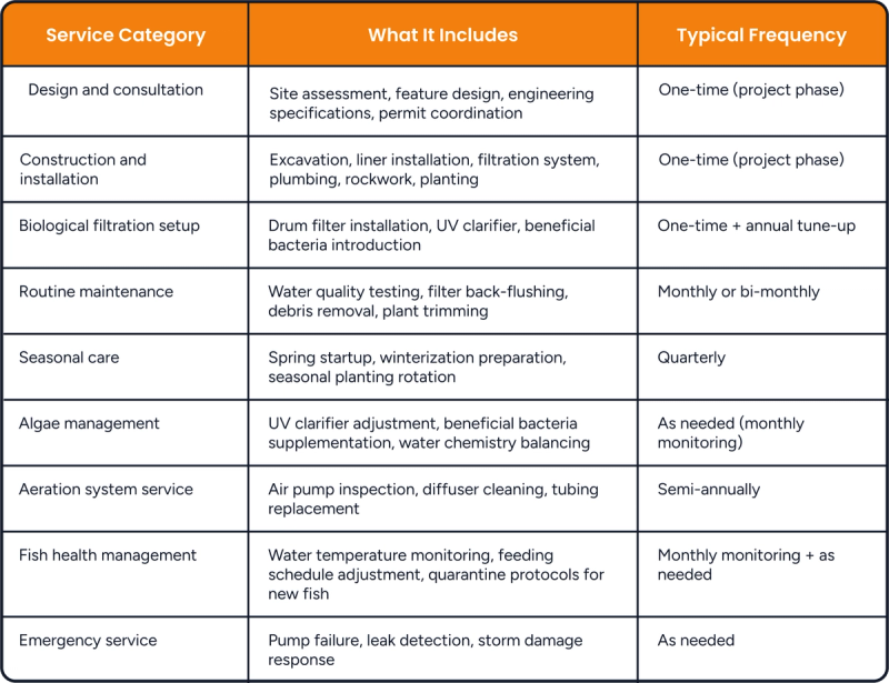 Key Takeaway: Commercial pond services cover design, construction, biological filtration setup, routine monthly maintenance, seasonal care, algae management, aeration service, fish health management, and emergency response — with professional-grade biological filtration as the engineering foundation that makes commercial water features virtually self-reliant.