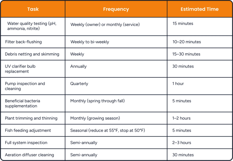 Understanding the maintenance cadence for commercial water features helps property managers budget accurately and set expectations for their facilities teams. The following schedule applies to a typical commercial koi pond or decorative water feature.