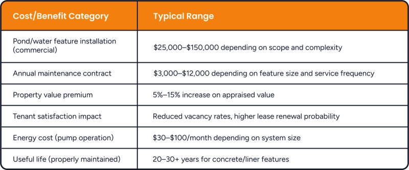The long-term financial case is clear: a $50,000 water feature generating a 10% property value premium on a $3 million commercial property adds $300,000 in appraised value. Against $8,000/year in maintenance costs, the feature pays for itself in the first year of ownership and generates ongoing returns through tenant appeal and property differentiation.